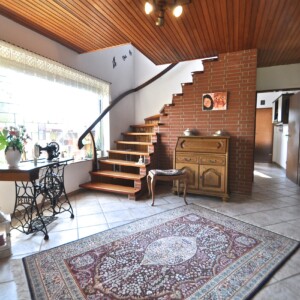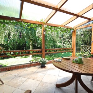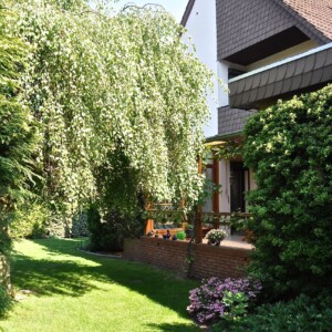 Über einen kleinen Windfang mit Garderobe erreichen Sie den Dielenbereich im Erdgeschoss. Die Zimmerverteilung des Hauses entspricht der klassischen Raumaufteilung, die auch heute noch bei Neubauten angewendet wird. So finden sich im Erdgeschoss neben einem Gäste-WC die rund 13m² große Küche und der über 42m² (!) große Wohn-/Essbereich. Im Wohnbereich laufen Sie auf Echtholz-Parkett, das Dank der regelmäßigen und intensiven Pflege aussieht „wie neu“. Über den Wohnbereich haben Sie Zugang zu einem überdachten Freisitz. Besonderes Highlight hier ist die Markise, sodass Sie hier wirklich zu jeder Tageszeit sitzen können.
