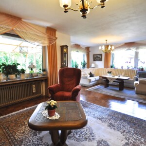 Um 1980 wurde das Erdgeschoss um einen ca. 55m² großen Anbau erweitert. Die große Fensterfront bietet einen herrlichen Blick in den prachtvollen Garten. In diesem Anbau befindet sich ein 4 x 8 m großes und 1,60 m tiefes Schwimmbecken! Damit haben Sie hier gleich zwei Möglichkeiten: Sie können im Schwimmbecken mit Gegenstromanlage etwas für Ihre Gesundheit tun und müssen dafür nicht ins öffentliche Schwimmbad. Alternativ können Sie das Schwimmbad abdecken (so wird es momentan genutzt) und den Raum als weiteren Wohnraum (beispielsweise als großen Wintergarten) nutzen. Ihrer Fantasie sind hier keine Grenzen gesetzt.