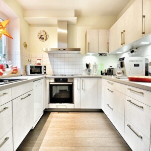 Herzstück im Erdgeschoss ist das geschickt kombinierte Wohn-/Esszimmer, das durch das edle Stäbchenparkett einen eleganten Charme versprüht. Die großen Glasfronten sorgen für viel Licht und einen echten Wohlfühlcharakter. Der dreizügige Schornstein bietet hier eventuell sogar die Möglichkeit einen Kaminofen nachzurüsten. Von diesem Raum haben Sie Zugang zu den Terrassen.